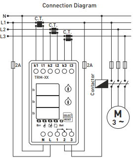 Quando o aparelho é ligado: O relé eletrónico de corrente da série TRM-300 foi concebido para desligar automaticamente os aparelhos quando a corrente máxima admissível é ultrapassada. Modos de reposição: - Modo manual: Após um defeito de sobreintensidade, o dispositivo tem de ser reposto premindo o botão Reset. Nota: Para mudar de modo, mantenha premido o botão SELECT durante 10 segundos. Quando o modo é alterado, a luz LED correspondente acende-se. Assimetria 50% (fixo) Se a diferença entre a maior e a menor corrente de fase exceder 50%, o dispositivo entrará no modo de erro de assimetria no espaço de 2 segundos. Quando ocorre um erro de assimetria: Parâmetros técnicos: - Tensão de funcionamento: 150-260 V AC